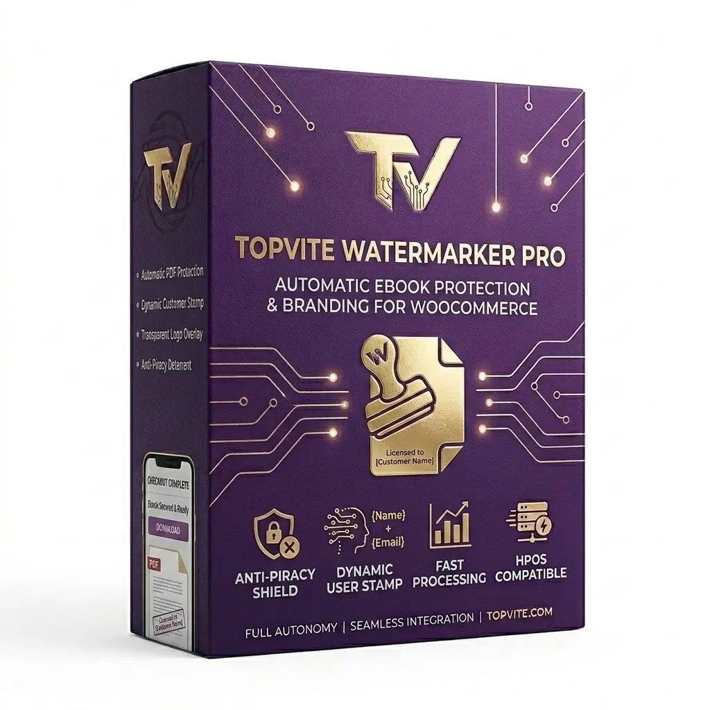 Our plugin intercepts the WooCommerce download process. Before the customer receives their file, the “TopVite Engine” generates a unique version of your PDF. It places a discreet, professional watermark containing the buyer’s personal information (Name and Email) and your company logo.
