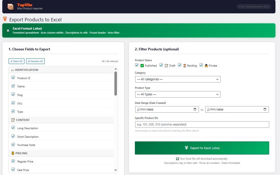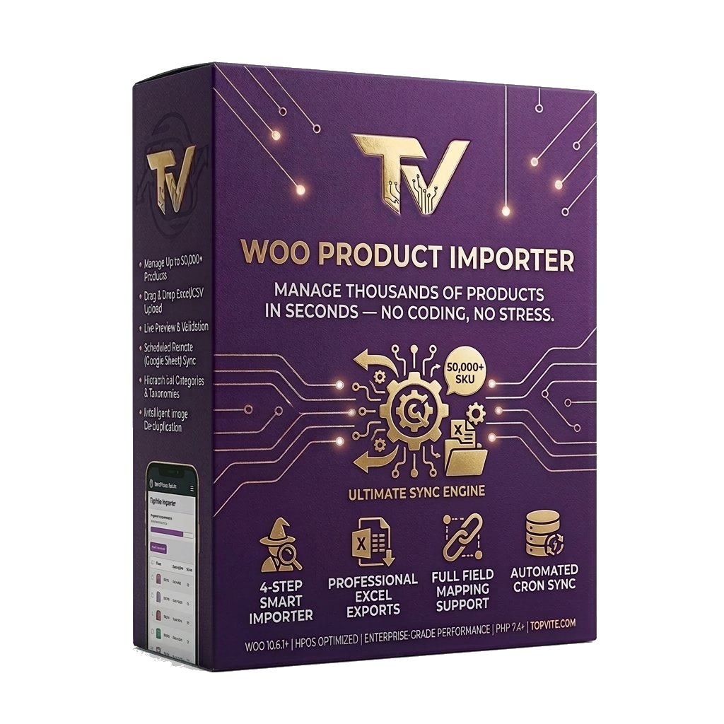 Stop wasting hours manually updating prices, descriptions, and stock levels. TopVite Woo Product Importer is the ultimate all-in-one solution designed for serious merchants who need to regain control over their catalog. Whether you manage 10 products or 50,000, our plugin scales with your business, ensuring fast, error-free, and professional data management.